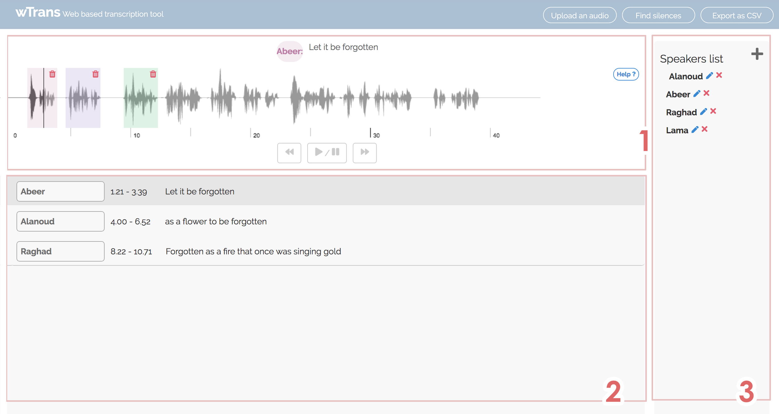 A web based application to provide a portable version of the famous transcription tools xTrans. wTrans supports a full range of speech annotation tasks, including quick and careful transcription.